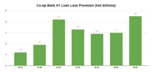 Total operating income increased by 10.86% to KSh 43.49 billion from KSh 39.23 billion, while operating expenses rose by 13.02% to KSh 24.04 billion from KSh 21.27 billion. Loan loss provisions climbed to KSh 4.5 billion, a 50.5% increase from KSh 3 billion in H1 2024, marking the highest level since the KSh 4.2 billion peak in 2021.